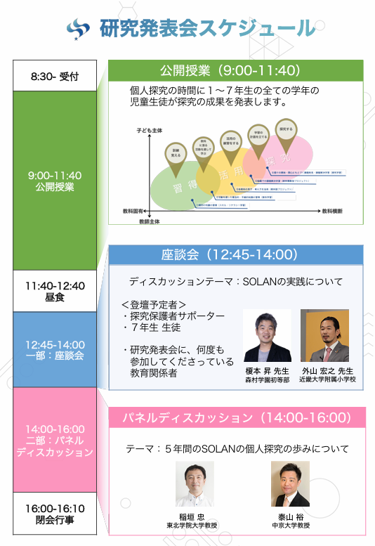 それを受けて、「5年間のSOLANの個人探究の歩みについて」をテーマに、今までSOLANのカリキュラム構築にご尽力いただいた中京大学泰山先生、東北学院大学稲垣先生を交えたパネルディスカッションを予定しています。参加者全員で学び合い・高め合う場にしたいと考えています。多くの教育関係者の皆さまのご参加をお待ちしています。