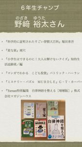 なお、チャンプの選んだ本には、栄誉を称え、選定者名入りの特製シールが貼られています。チャンプたちの“推し本”を通じて、みなさんの読書の世界をさらに広がることを願っています。