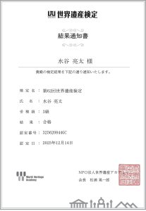LCA国際小学校の提携校です 重要 2026年度 教職員絶賛募集中!「未来を担う子どもたちを共に育てませんか?」 NEWS & EVENTお知らせ & イベント 探究レポートお知らせイベント HOME > お知らせ > お知らせ > 4年生の水谷亮太さんが、世界遺産検定で合格しました! 4年生の水谷亮太さんが、世界遺産検定で合格しました! 4年生の水谷亮太さんが、世界遺産検定で合格しました! 【名前】 4年生 水谷亮太 【出場大会・賞】 世界遺産検定 3級 【保護者様から一言】 合格おめでとう。 新しい事を学ぶ姿勢は本当に素晴らしいです。 次の二級への挑戦も応援しています。 お知らせ|2025.12.15 お知らせ一覧