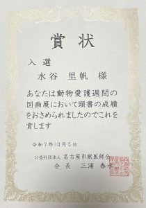 LCA国際小学校の提携校です 重要 2026年度 教職員絶賛募集中!「未来を担う子どもたちを共に育てませんか?」 NEWS & EVENTお知らせ & イベント 探究レポートお知らせイベント HOME > お知らせ > お知らせ > 2年生の水谷里帆さんが、動物愛護週間の絵画展で入賞しました! 2年生の水谷里帆さんが、動物愛護週間の絵画展で入賞しました! 2年生の水谷里帆さんが、動物愛護週間の絵画展で入賞しました! 【名前】 2年生 水谷里帆 【出場大会・賞】 動物愛護週間の絵画展 入賞 【保護者様から一言】 入賞おめでとう。 丁寧に細かい所も頑張って描いた絵が認められて、とても嬉しく思います。 これからも色々な事に挑戦してください。 お知らせ|2025.12.15 お知らせ一覧