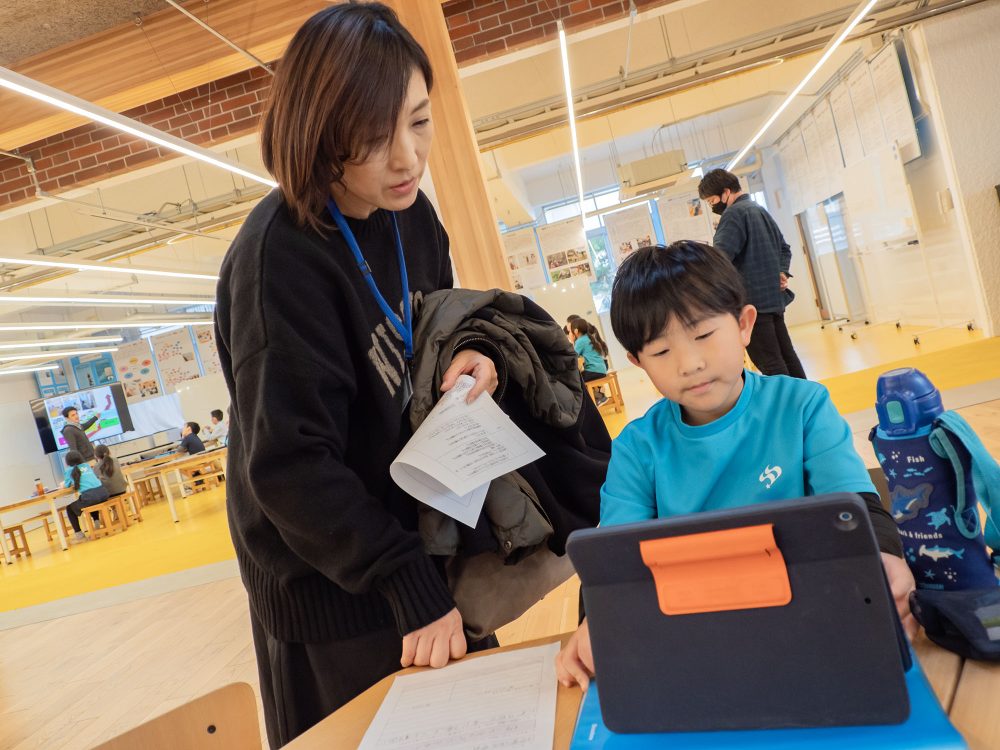 子どもたちは、教員からもらったアドバイスやコメントを元に探究計画カードの修正を行いました。日頃から計画や記録は“具体的に書く”と伝えているので、教員も子どもたちのカードを読み、時折質問も交えながら、子どもたちの探究計画を入念にチェックしていました。